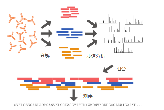 圖1.抗體從頭測序過程。首先,用多種酶將抗體樣品進行分解。每種酶都有不同的切割模式(以不同顏色表示),且每種酶都不會給抗體序列產生新的肽。抗體從頭測序利用從多個酶分解物中產生的重疊肽來實現抗體的完全覆蓋,并確保當中沒有遺漏任何一個序列。