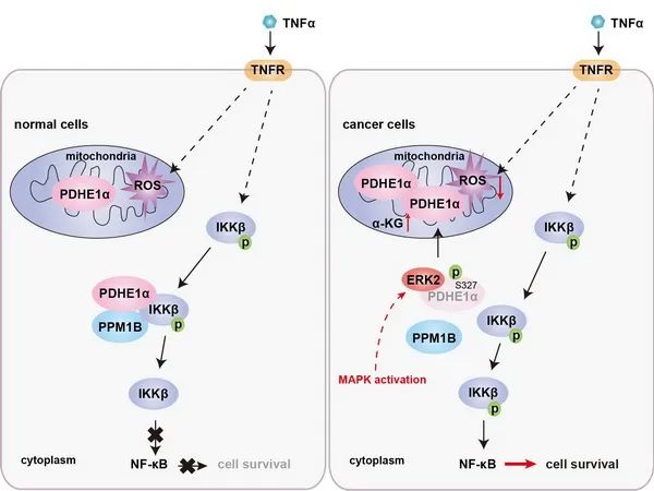 然而,MAPK等致癌信號(hào)(oncogenic signaling)的激活,導(dǎo)致胞質(zhì)PDHE1α S327位點(diǎn)被ERK2磷酸化并轉(zhuǎn)位到線粒體;胞質(zhì)PDHE1α水平的下降恢復(fù)了NF-κB信號(hào)通路的活化;線粒體PDHE1α的增多提升了α-酮戊二酸的含量,并促進(jìn)了炎癥因子刺激下腫瘤細(xì)胞的ROS解毒。NF-κB的活化和ROS的清除共同促進(jìn)腫瘤細(xì)胞在炎癥因子刺激下的存活,增強(qiáng)了腫瘤細(xì)胞對(duì)CTLs的耐受性,促進(jìn)了腫瘤的免疫逃逸和抗PD-1治療的耐藥性。