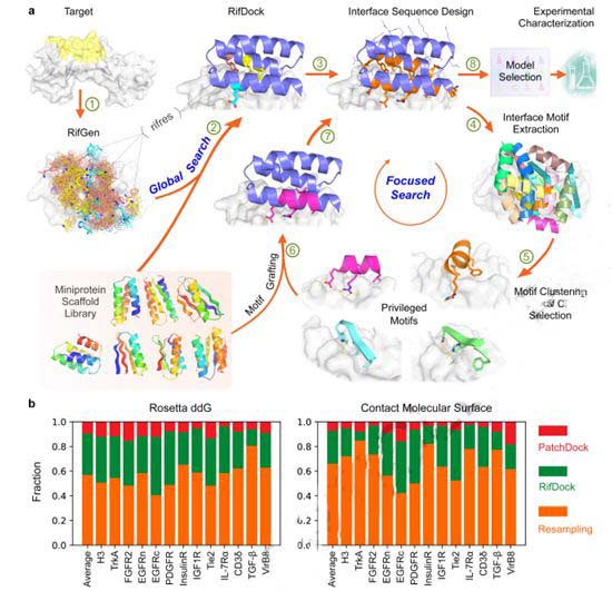 這些結合了計算蛋白設計領域的最新進展,開發(fā)出一種產生新蛋白的策略,這些新蛋白以類似于抗體的方式結合它們的分子靶標。他們開發(fā)的軟件可以掃描靶分子,識別潛在的結合位點,產生靶向這些位點的蛋白,然后從數(shù)以百萬計的候選結合蛋白中進行篩選,以確定那些最可能發(fā)揮作用的蛋白。