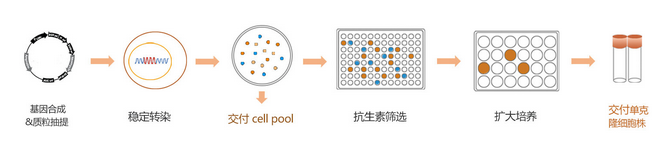 用轉染質粒或病毒侵染的方法將構建好的含靶基因的載體導入細胞,根據不同的基因載體中所含的抗性標志選用相應的藥物進行篩選混合陽性克隆。在陽性混合克隆的基礎上,得到單細胞長出的陽性單克隆,繼而得到穩定轉染細胞株。常用的真核表達載體的抗性標志物有嘌呤霉素(puromycin)、潮霉素(hygromycin)和新霉素(neomycin)。