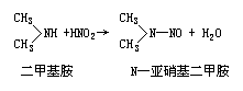 另外,上述反應生成的亞硝酸還能與人體和動物內的蛋白質代謝的中間產物仲胺 ( 如二甲基胺 ) 合成亞硝胺: