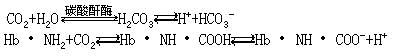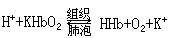 此時,由于組織氧分壓低,KHbO2釋放氧而成脫氧血紅蛋白(KHb),堿性增強,可接受所生成的H 成為HHb,而緩沖pH值的變化,并促進H2 CO3 和Hb·NH·COOH的生成過程: