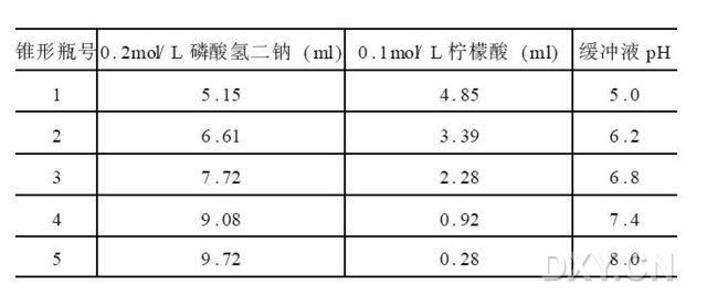 0.5%淀粉溶液(含0.3%氯化鈉)(新鮮配置),碘-碘化鉀溶液(4 g碘及碘化鉀6 g溶于100 ml蒸餾水中,于棕色瓶中保存),0.2 mol/L磷酸氫二鈉溶液,0.1 mol/L檸檬酸溶液。