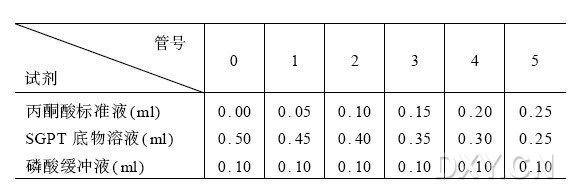 2. SGPT底物溶液:準(zhǔn)確稱取α-酮戊二酸87.6 mg,dl-丙氨酸5.34g,先用90 ml 0.1 mol/L pH7.4的磷酸緩沖液溶解,然后用20%NaOH溶液調(diào)至pH7.4,再以上述磷酸緩沖液稀釋至300 ml,冰箱保存可用一周(加氯仿防腐)。