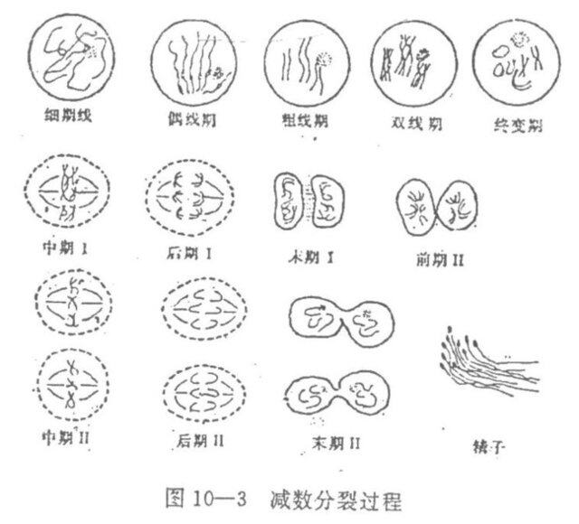 ③粗線期(Pachytene stage)每對同源染色體聯合完成,縮短成較粗的線狀,稱為雙價染色體,因其由四條染單體組成,又叫四分體。