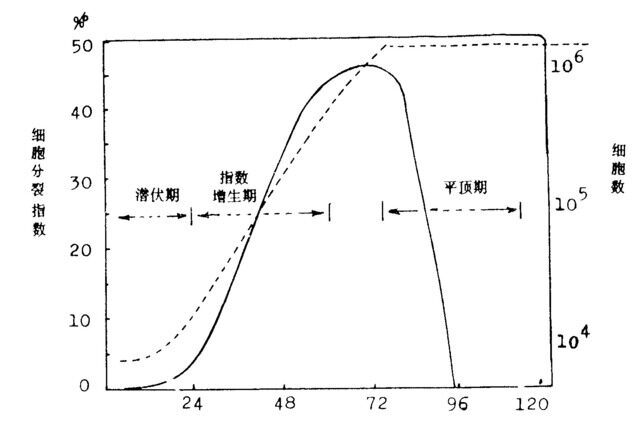 注意,細胞分裂指數曲線與生長曲線趨勢基本一致,但不完全相同,如當細胞增長達飲飽合密度并進入停止期后,細胞數值很大,而分裂相可完全消失。