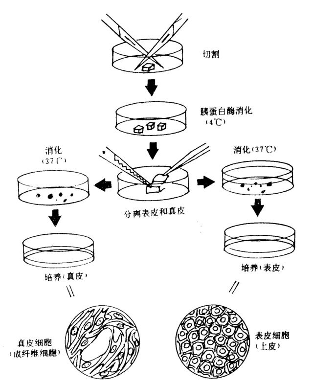 取外科植皮或手術殘余皮膚小塊,以角化層薄者為佳,早產(chǎn)流產(chǎn)兒皮膚更好,切成 0.5~1 平方厘米小塊;