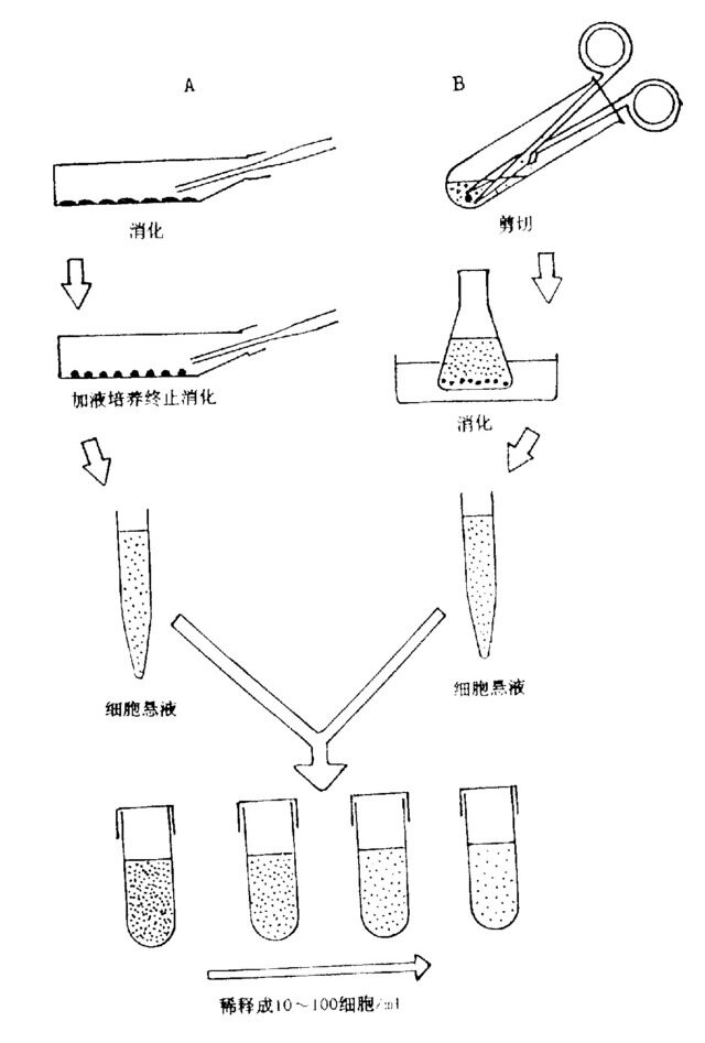 做克隆細胞時首先需先用消化法制備出分散成單個細胞懸液:然后稀釋細胞,使之成為1~2 細胞/毫升懸液;最適宜細胞密度為1~2 細胞/ml 培養(yǎng)液;