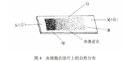 用自己制作的血涂片,選擇較均勻的部分觀察。由于白細(xì)胞在血片上分布不勻,大細(xì)胞(如單核細(xì)胞和粒細(xì)胞)多分布于血片的兩邊和尾部,小細(xì)胞(如淋巴細(xì)胞)則多分布于中間(圖4),故可根據(jù)這一分布規(guī)律來(lái)尋找。