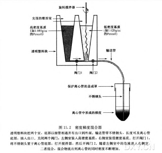 一種連續(xù)性的線性梯度可以在梯度形成器里通過混合不同濃度的 Percoll 而實現(xiàn)。例如,在梯度發(fā)生器里混合 1.020 g/ml 及 1.080 g/cc 的 Percoll(Fisons、Pharmacia、Buchler)。