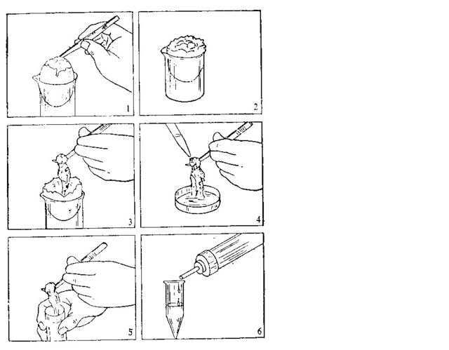 置入燒杯中用剪刀剪碎胚體后,再用組織研磨器研磨;或放入20—50 ml注射器中(無針頭)直接壓擠入無菌小燒杯中;