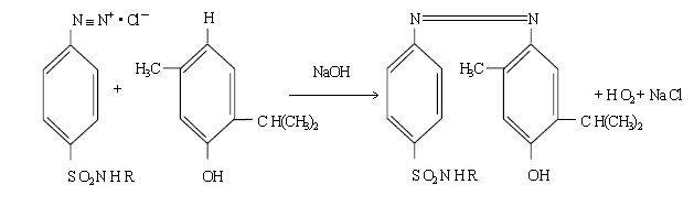偶聯反應:鹽酸重氮苯磺胺與麝香草酚在堿性溶液中發生偶聯反應生成橙黃色 的偶氮化合物。