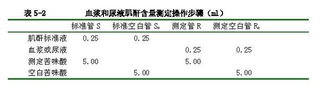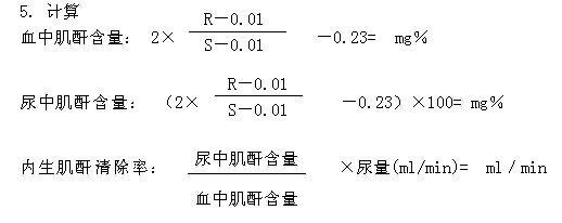 血、尿肌酐測定方法(見下表 5-2)和內生肌酐清除率的計算。 將尿樣稀釋:將尿液充分混合后,取出 1 ml 尿液,用蒸餾水將其稀釋 100 倍,以備測定尿中肌酐含量。