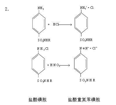碘胺類藥物生成有色物質的反應如下: 一、重氮化:磺胺與亞硝酸反應,生成重氮鹽,因亞硝酸易分解,無現成制劑,所以實驗中用亞硝酸鈉,使其與鹽酸反應生成亞硝酸,磺胺也必須首先與鹽酸反應,使其苯核上的氨基(-NH2)離子化生成銨類(-NH3+)化合物才能與亞硝酸發生重氮化反應。