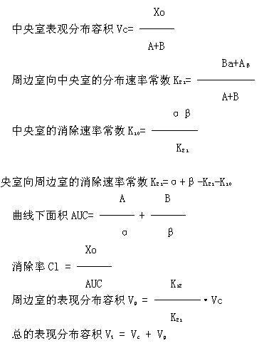 ①用計算器對拐點后的消除相各時間及相應的血濃度進行直線回歸,求出直線的截 距 a 和斜率 b;進而求出 B=10a,β=-2.303b(若為一房室,β為K);根據 t1/2 =0.693/β,求出消除相半衰期 tl/2;最后寫出消除相的經時方程 Ct=B·e-βt。