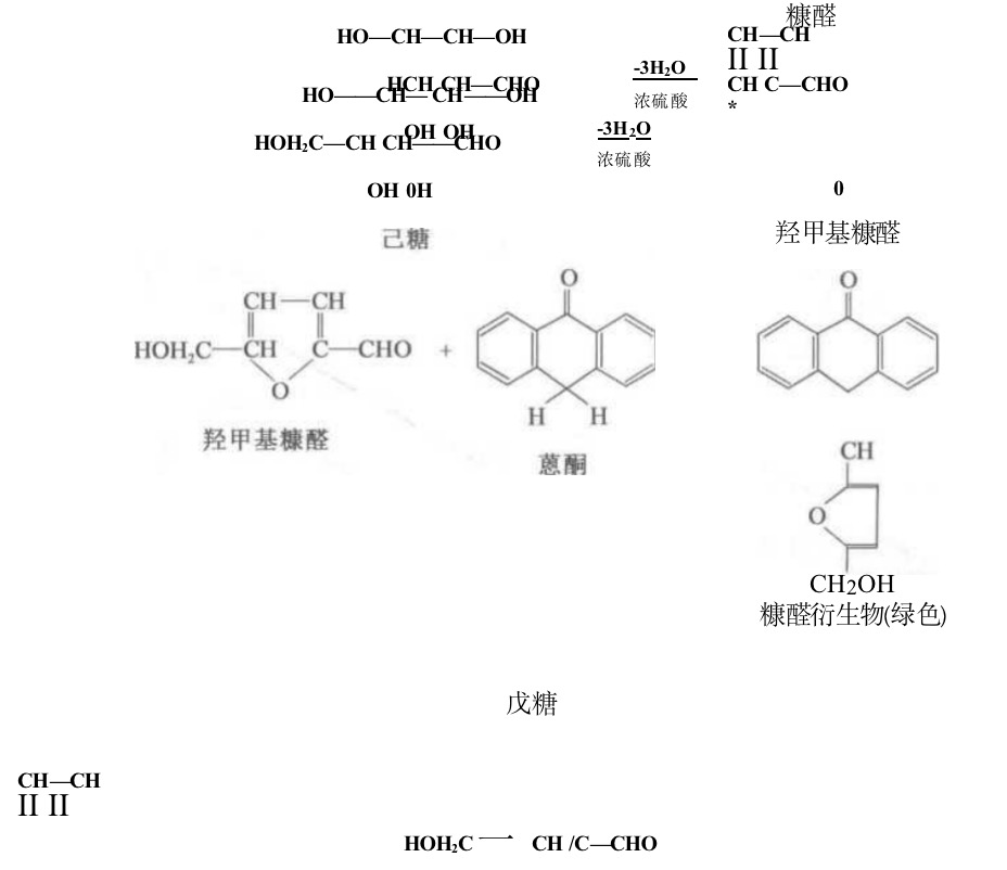 植物組織中可溶性糖含量的測定的基本原理是糖(sugar)在濃硫酸作用下,可經脫水反應生成糠醛或羥甲基糠醛,生成的糠醛 或羥甲基糠醛與蔥酮脫水縮合,形成糠醛的衍生物,呈藍綠色,其吸收峰為625 nmo在一定 范圍內,顏色的深淺與糖的含量成正比, 故可用于糖的定量測定。