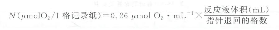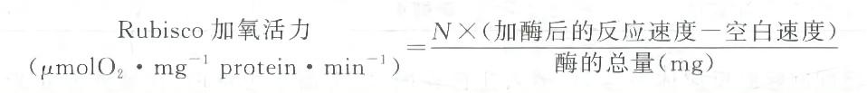 2. 氧電極測(cè)定法測(cè)定 Rubisco 加氧酶活力:將 2 mL 氧電極法反應(yīng)液,在大氣中攪拌 10 min, 使溶液中的溶解氧與大氣平衡。然后把電極放在反應(yīng)室上,調(diào)節(jié)測(cè)氧儀的靈敏度旋鈕,使記錄儀至滿刻度,再加入 0.1 mL 飽和的亞硫酸鈉,除盡水中的氧,指針退回到接近 0 點(diǎn),根據(jù)指針退回的格數(shù)和 25 ℃ 水的溶解氧量,就可以計(jì)算出每格記錄紙所代表的溶氧量。 25 ℃ 時(shí)的水溶氧量為 0.26 μmol?mL-1。每格記錄紙代表的溶氧量計(jì)算如下: