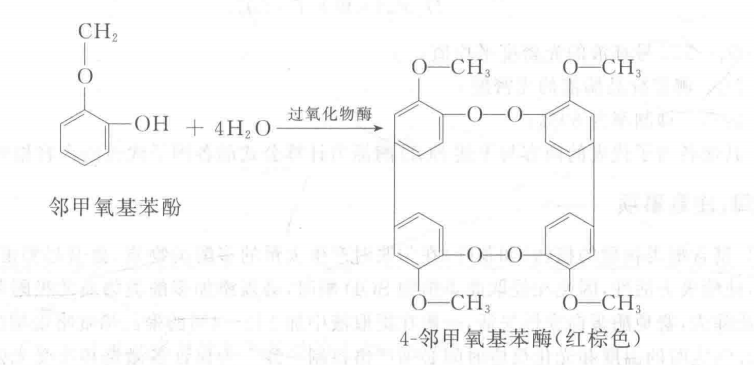 過氧化物酶(POD)催化過氧化氫氧化酚類的反應,產物為醍類化合物,此化合物進一步縮合或與其他分子縮合,產生顏色較深的化合物。本實驗以鄰甲氧基苯酚(即愈創木酚)為過氧化物酶的底物,在此酶存在下,H2O2將鄰甲氧基苯酚氧化成紅棕色的4-鄰甲氧基苯酚,該物質可用分光光度計在470 nm處測定其吸光值,即可求出該酶的活性。其反應為: