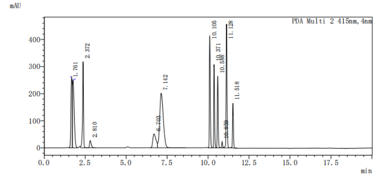 其次按照國標的液相方法參數進樣,根據喹啉黃色譜圖中各個異構體的峰面積,采用面積歸一化法定量。