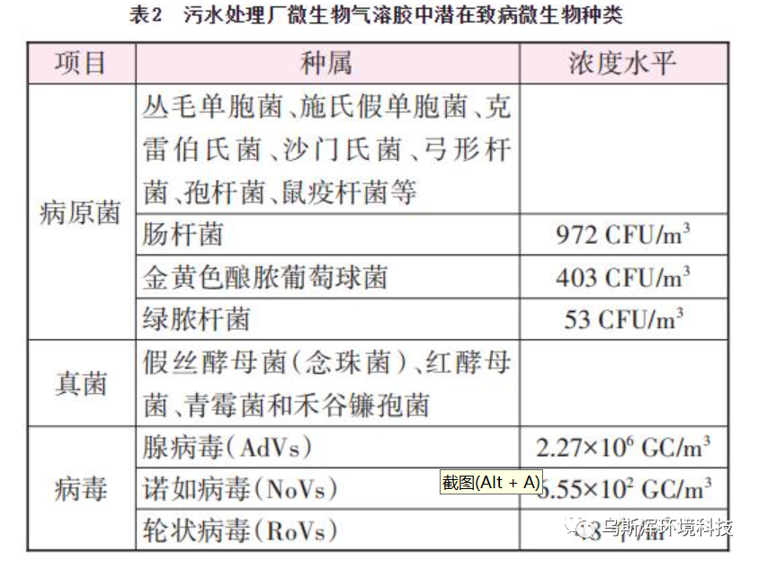 污水處理過程產(chǎn)生的微生物氣溶膠中的微生物種類較多(如細菌、真菌、病毒等)。Yang等對比A2/O和氧化溝,發(fā)現(xiàn)不同污水處理工藝產(chǎn)生的微生物氣溶膠的微生物群落結(jié)構(gòu)存在顯著差異。研究已經(jīng)發(fā)現(xiàn)微生物氣溶膠含有人類健康風險微生物,主要包括病原菌、真菌和病毒等。這些微生物可能通過呼吸道吸入、皮膚接觸和攝入而感染人類(尤其是污水處理廠工作人員),并引起各種疾病如上呼吸道感染、痢疾等。