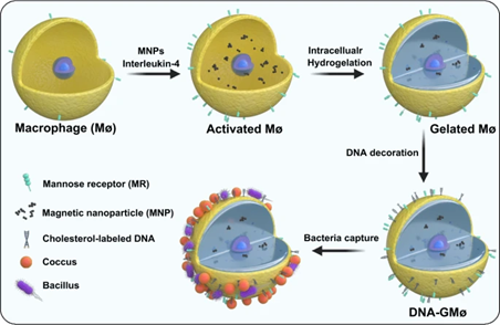 首先將M?s與超順磁性氧化鐵納米顆粒孵育,以獲得磁性細胞。同時使用細胞因子(如IL-4)誘導病原體結合受體的上調。然后通過直接滲透光引發劑和單體,以及隨后的紫外線照射,實現胞內水凝膠化。最后,響應特定細菌的DNA傳感元件(例如DNAzyme)可以很容易地修飾在凝膠細胞上,以便方便,快速和高靈敏度的熒光讀數。
