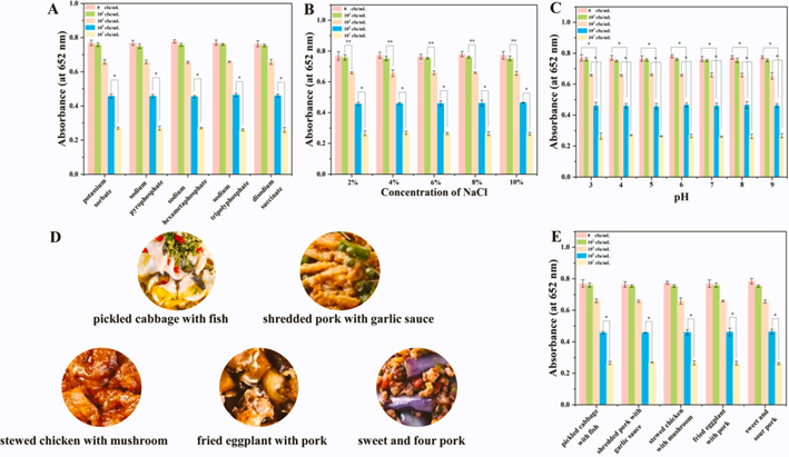 在LB培養基中添加相同濃度的金黃色葡萄球菌時,不同食品添加劑、不同NaCl濃度、不同pH值存在下,SapYZUs7@MnCo2O4反應體系的吸光度值一致。結果表明這些因素不影響金黃色葡萄球菌的檢測。SapYZUs7@MnCo2O4成功應用于不同添加劑、NaCl濃度和pH值的食品樣品中S. aureus的顏色測定。此外,使用研究人員提出的 SapYZUs7@MnCo2O4顯色系統獲得的結果與傳統方法的結果一致。