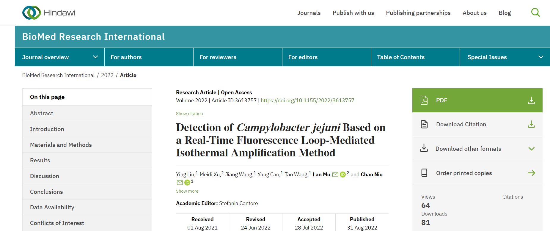 參考文獻:Ying Liu , Meidi Xu, Jiang Wang, Yang Cao , Tao Wang , Lan Mu , Chao Niu.Detection of Campylobacter jejuni Based on a Real-Time Fluorescence Loop-Mediated Isothermal Amplification Method,2022.8