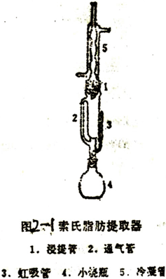 索氏(soxhlet)脂肪提取器為一回餾裝置(圖2-1),由浸提管、小燒瓶及冷凝管三者連接而成。浸提管兩側分別有虹吸管及通氣管,盛有樣品的濾紙斗(包)放在浸提管內。溶劑(乙醚)盛于小燒瓶中,加熱后,溶劑蒸汽經通氣管至冷凝管,冷凝之溶劑滴入浸提管,浸提樣品。浸提管內溶劑愈積愈多,當液面達到一定高度,溶劑及溶于溶劑中的粗脂肪即經虹吸管流入小燒瓶。流入小燒瓶的溶劑由于受熱而氣化,氣體至冷凝管又冷凝而滴入浸提管內,如此反復提取回餾,即將樣品中的粗脂肪提盡并帶到小燒瓶中。最后,將小燒瓶中的溶劑蒸去,烘干,小燒瓶增加之重量,即樣品中粗脂肪含量。